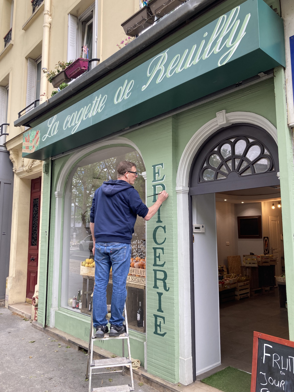 Décoration d'une épicerie parisienne. Confection du logo et lettrage