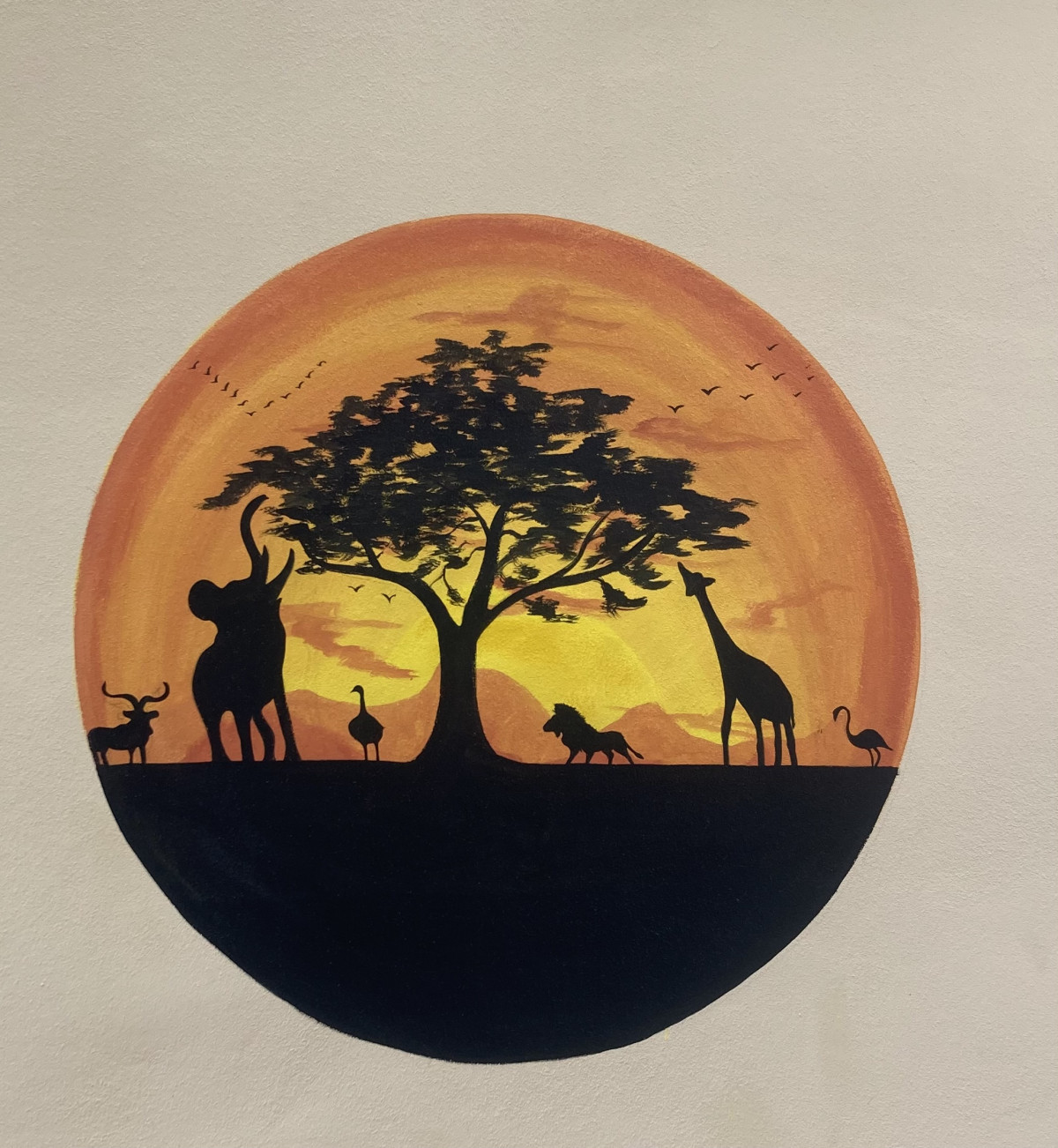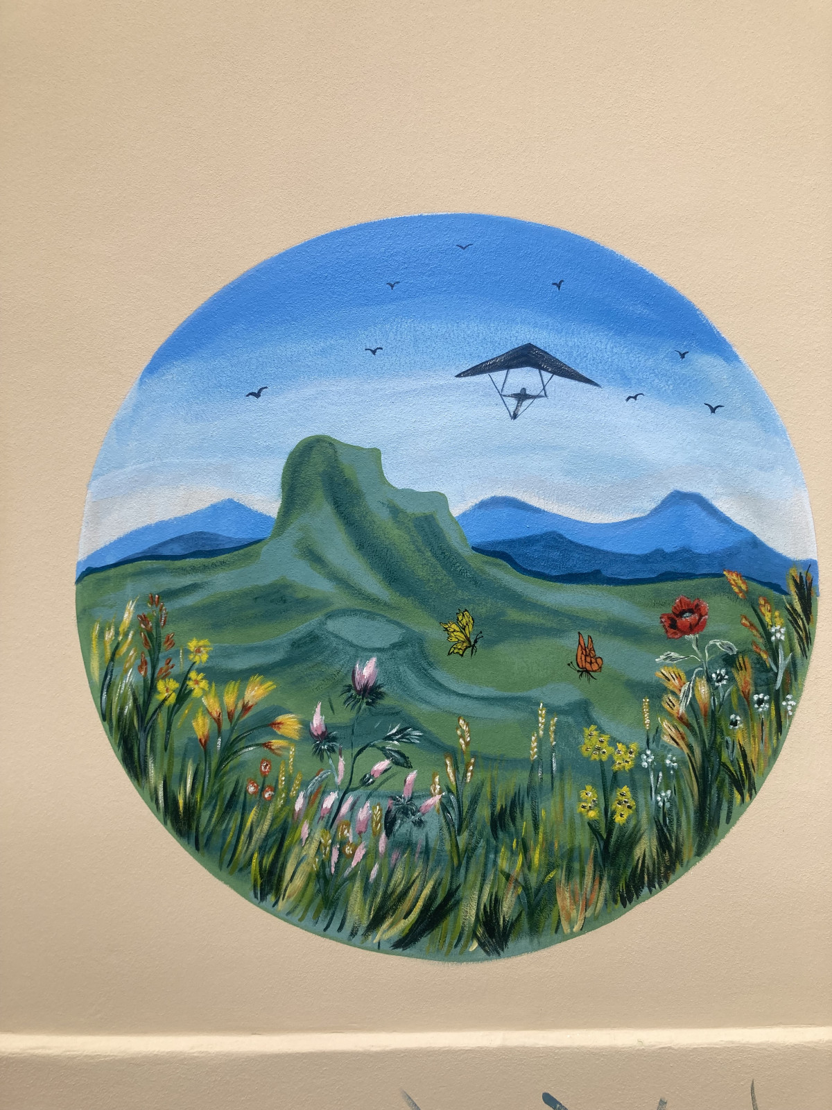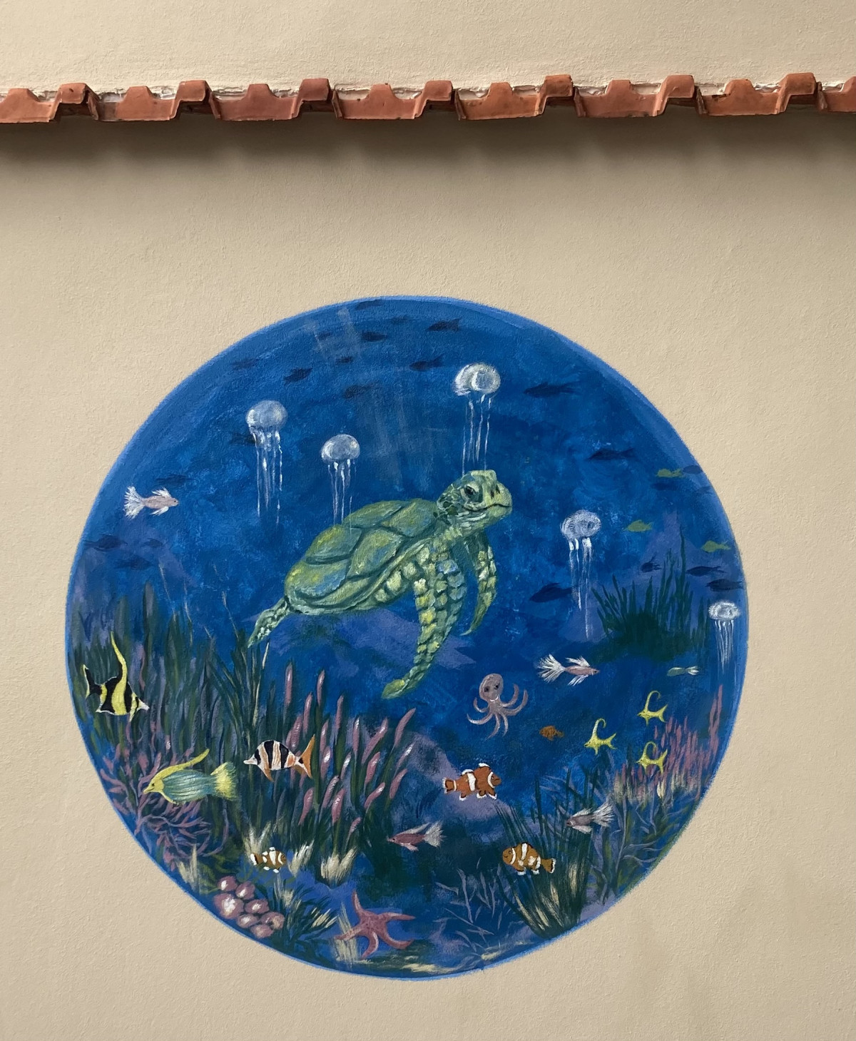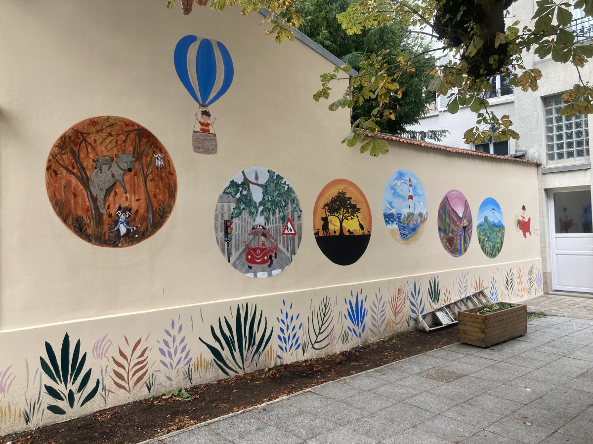 Fresque représentant des bulles remplies de saisons, animaux, continents... Réalisée dans un hôpital de jour pour et avec les enfants.