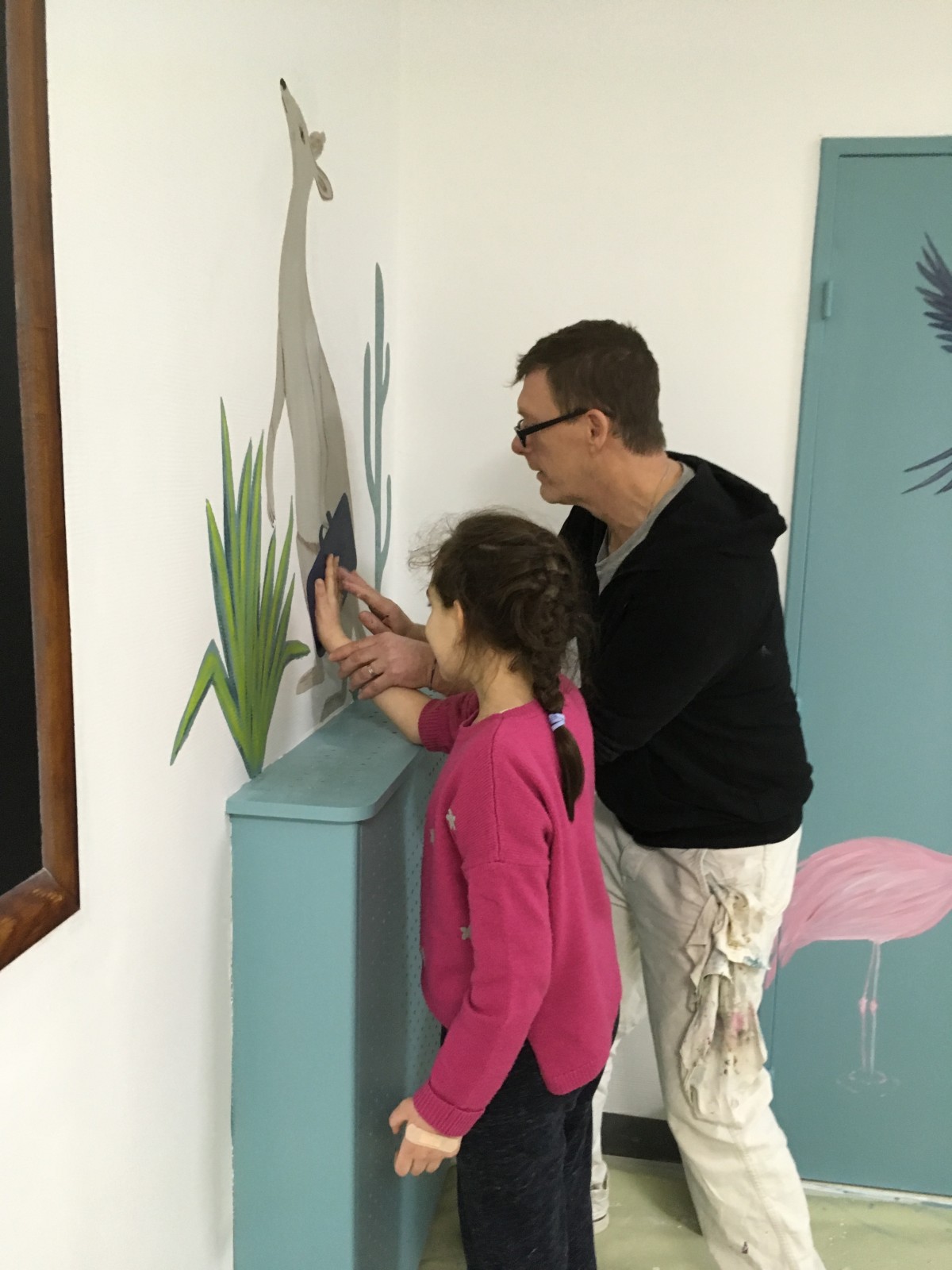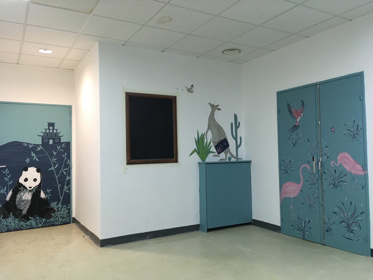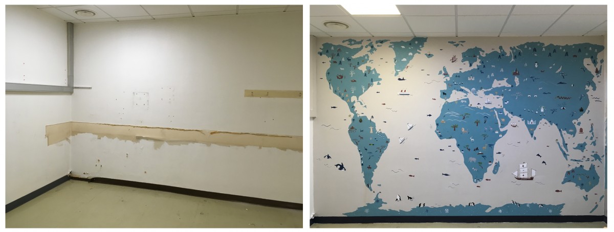 Fresque géante réalisée à la demande d’un service hospitalier pour décorer une pièce destinée à accueillir un public enfant. La décoration a été effectuée après une totale remise à blanc. (Enduit, ponçage, peinture blanche) Les trois autres murs ont été décorés de plusieurs peintures sur le thème du voyage à travers le monde.